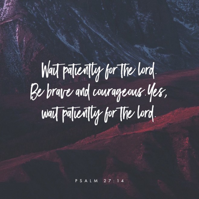 Twice repeated is the phrase “Wait for the Lord” . Sandwiched between them is “Be strong and courageous!” We are certainly to be bold and strong in our faith, as long as the Lord goes before us. I think the Lord needed to remind us twice to wait on Him because we often don’t, and then bleat like sheep when we find ourselves in danger. He told Joshua to be strong and courageous to arm him for the promised land. Now He calls to us, “Be strong and of good courage” but also to wait for His timing.