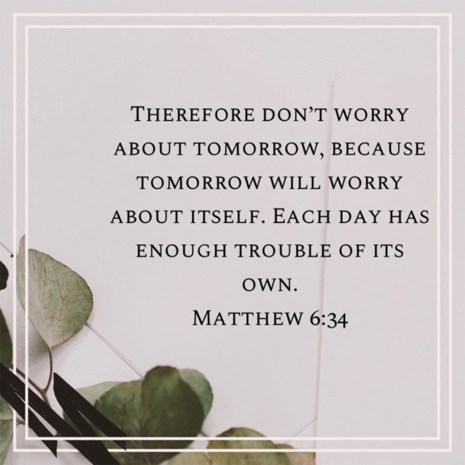Do you ever worry? That little that creeps up in your gut when you’re unsure what the future holds, or if the paycheck will make it to the bank before the check you wrote on it? (guilty) Some of us like to live dangerously. Others worry. This verse is my go to verse on worry, for I love the last phrase. Each day has enough trouble of its own.