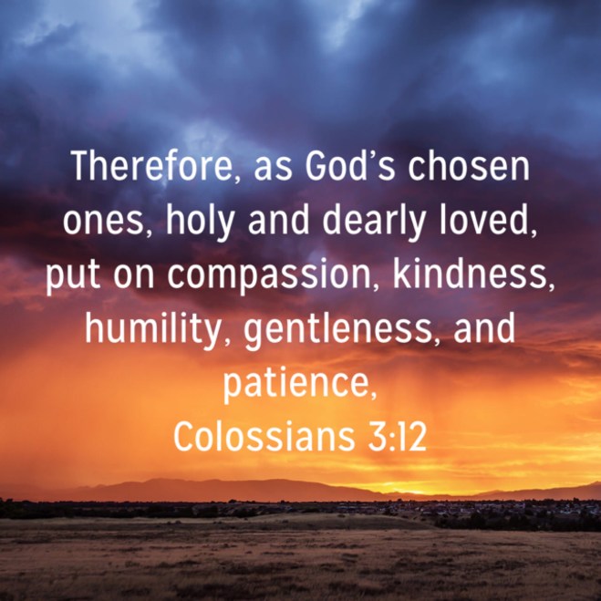 Note the verse above. Three things that come from God are being chosen, holiness, and being dearly loved. Because of those three things, things which we have no power to do ourselves, we acquire and practice the following character traits. These traits help define our character, and we do not achieve them all at once. It takes time and practice to go develop compassion. It takes effort to develop kindness and gentleness. We have to work to suppress pride to humility. Patience, well, you learn through experience. All of these things are within our power to do. But we also have the power of the Holy Spirit to help us be more Christlike. A good person might have one or more of these qualities, but all of them? No. A Christian needs the peaceful contented presence of the Holy Spirit to be able to hold all of these at the same time, to practice to a greater or lesser degree each in turn.