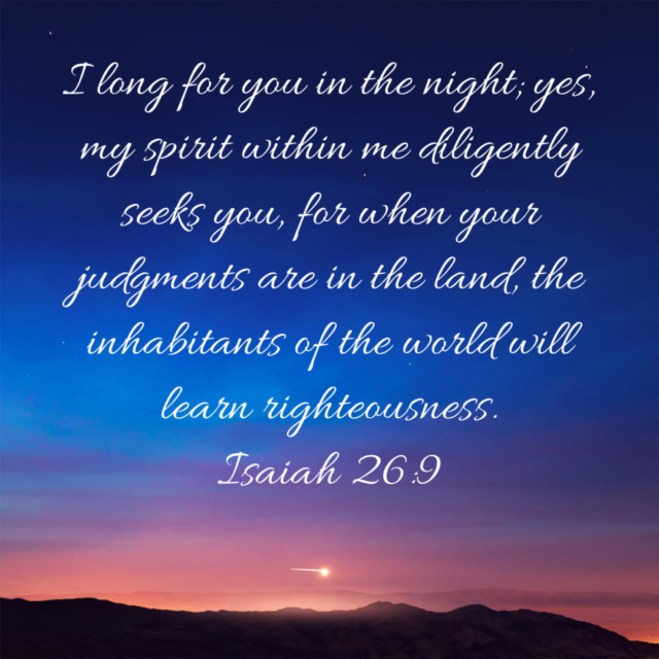 Need someone? Isaiah’s words here encapsulate what I’ve been feeling for a long time. Night time can be a lonely time. It when you long for a companion, one who is true and present with with you, you can’t go wrong with God. Of course what he is speaking to here is prayer and meditation on God. He is speaking to soaking in the Word of God to hear the voice of God.