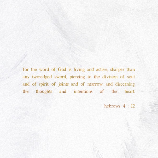 The Word of God (the Scripture given by the Holy Spirit) is living and active. Important to remember this. Since the word given by the Spirit separates soul from spirit, what is the nature of this separation? Simply? It is the separation of the will of the soul from the will of the spirit. The word of God makes that separation very stark. When we read the word of God, we find what He wants, and how that is often different from what we want. The word of God isn’t old and dead, like many religions of long ago. It is living and active, even to reach into your soul right now and make it plain to you what God wants. God isn’t an old god from an old faith. He is present. He is near, and He is speaking into you through His word. It is a powerful thing to be considered worthy of hearing the will and word of our Creator.