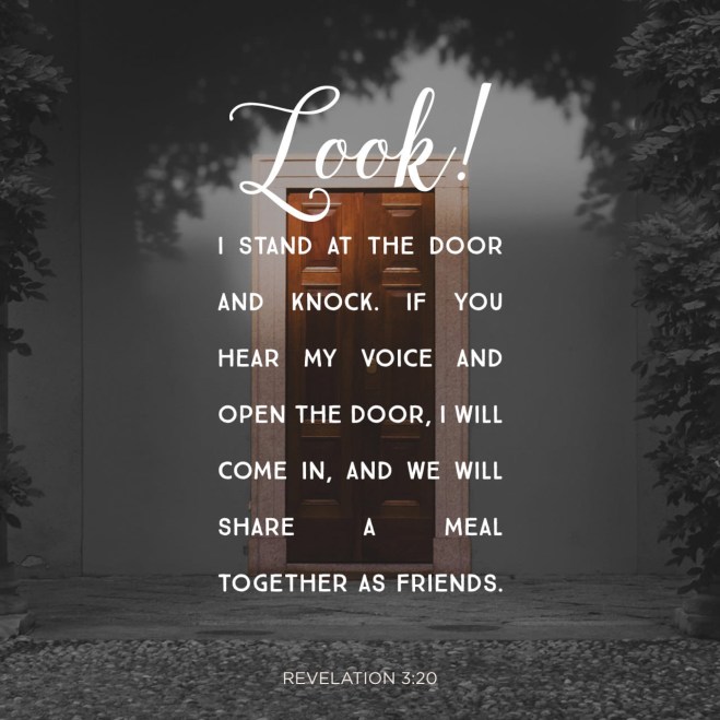 But knock He does. Behind your closed door, what do you do? Do you tell Him to come back later when you have time? Do you tell Him to wait a minute while you get your life cleaned up so He has a place to sit? Do you crack the door open and ask Him, “What do you want?” Do you let Him in?