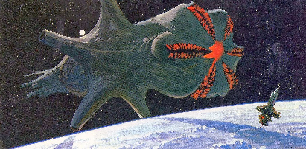 Fast forward to the first Star Trek Movie. There we meet Captain Decker’s son, Matthew Decker, who has been to Starfleet Academy and become a Captain in his own right, now overseeing the refit and future mission of the Enterprise. But now comes another threat, another entity threatening earth with destruction. It turns out to be a very similar cylindrical vessel with a large opening on one end, just like the Doomsday Machine but with extra pieces. What a surprise. This is concept art for V’Ger.