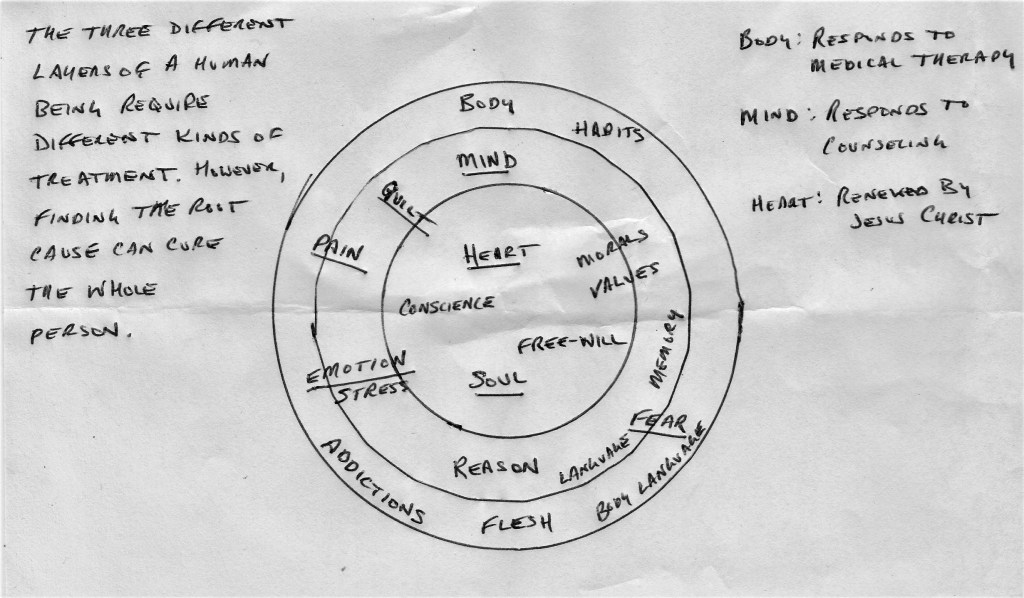The heart is also considered in Biblical terminology the place of the soul, as distinct from the mind. In my work as a Chaplain, I’ve discovered that people have three distinct layers to their person, as illustrated below: