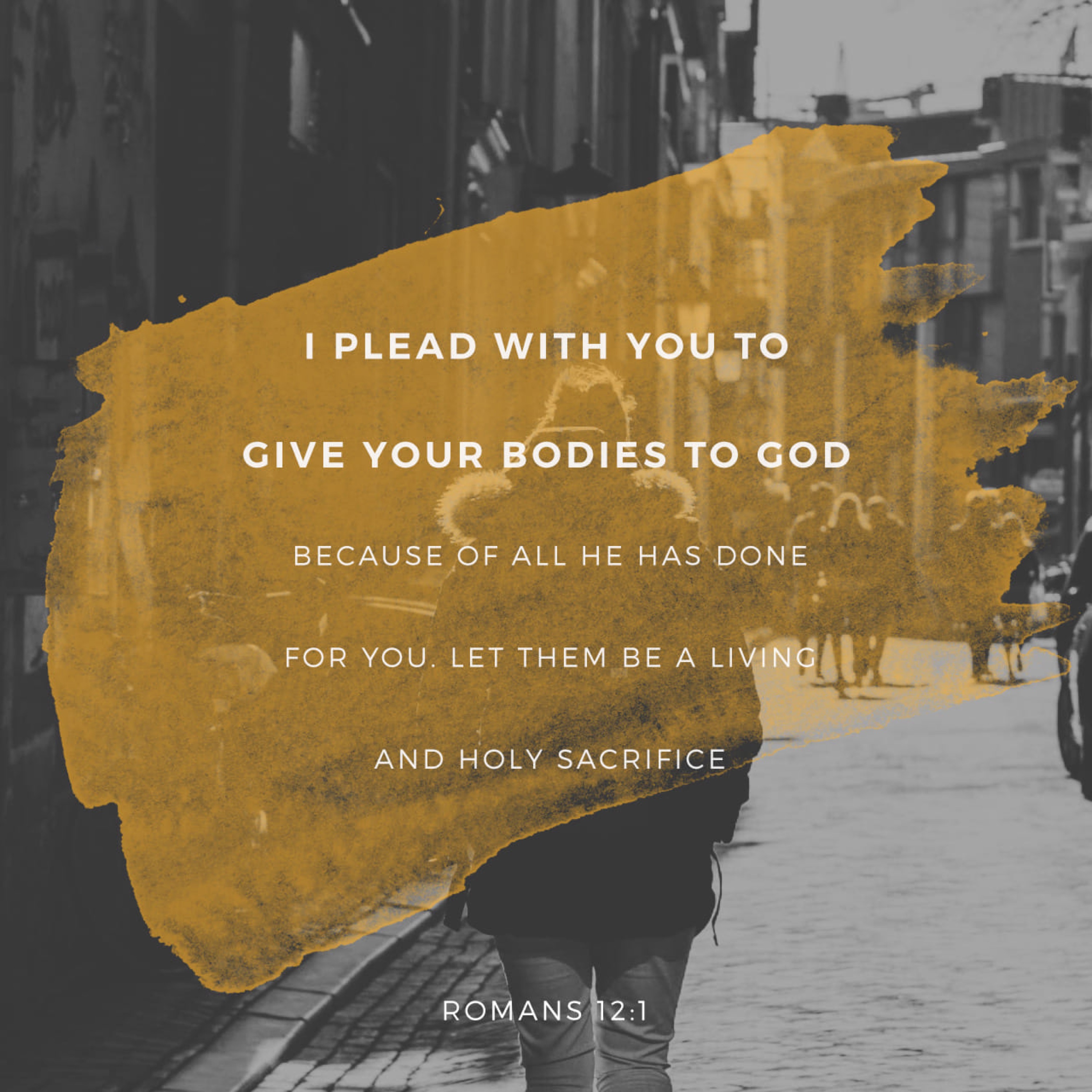 “Therefore, brothers and sisters, in view of the mercies of God, I urge you to present your bodies as a living sacrifice, holy and pleasing to God; this is your true worship.”