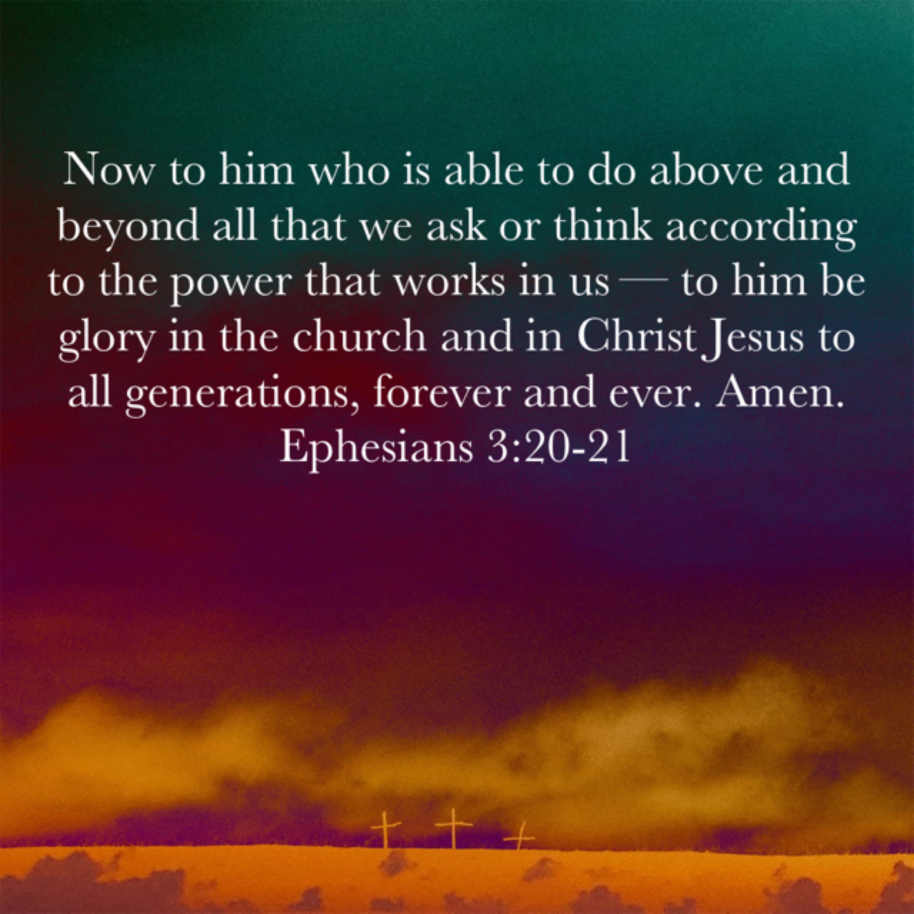 I want you to notice something else about this verse. He is able to do above and beyond all that we ask or think. I know that when I pray to God, and petition Him for certain outcomes, my imagination can only go so far. I can imagine a healing or a relief from stress or something minor like that. But God has infinite creativity. He is able to “do” beyond anything that we can “ask or think.” God “does” more before breakfast than I could ever imagine thinking. So in our limited capacity, we can ask, we can hope, and we can imagine, but God can DO. And His work surpasses anything that we could come up with.